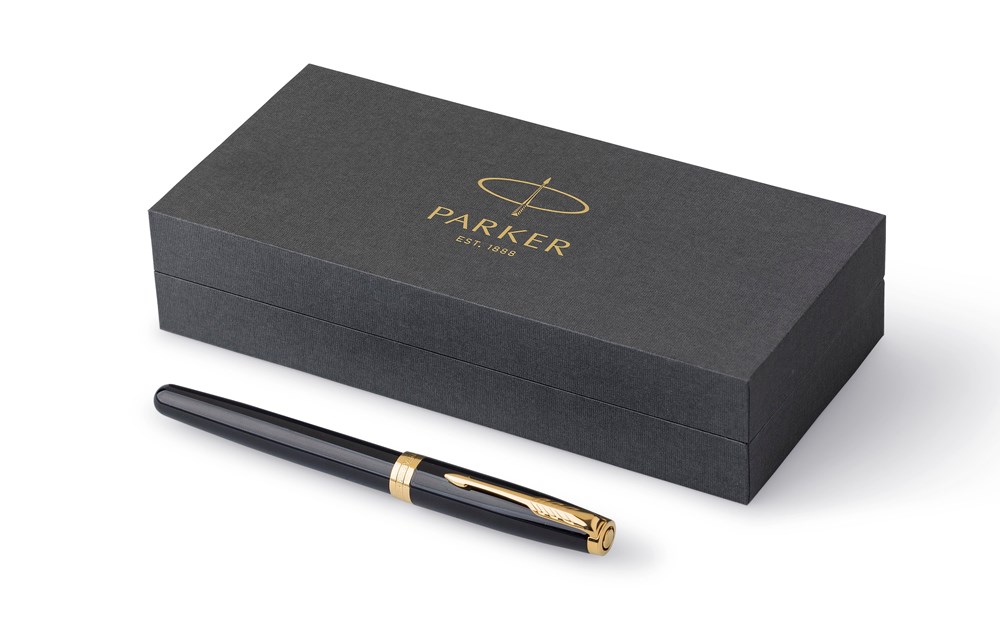 Parker Rollerball Sonnet Schaft und Kappe aus Edelstahl, akzentuiert durch Clip und Zierleiste in Goldoptik. Tintenfarbe: schwarz. Verpackt in einer Geschenkbox.