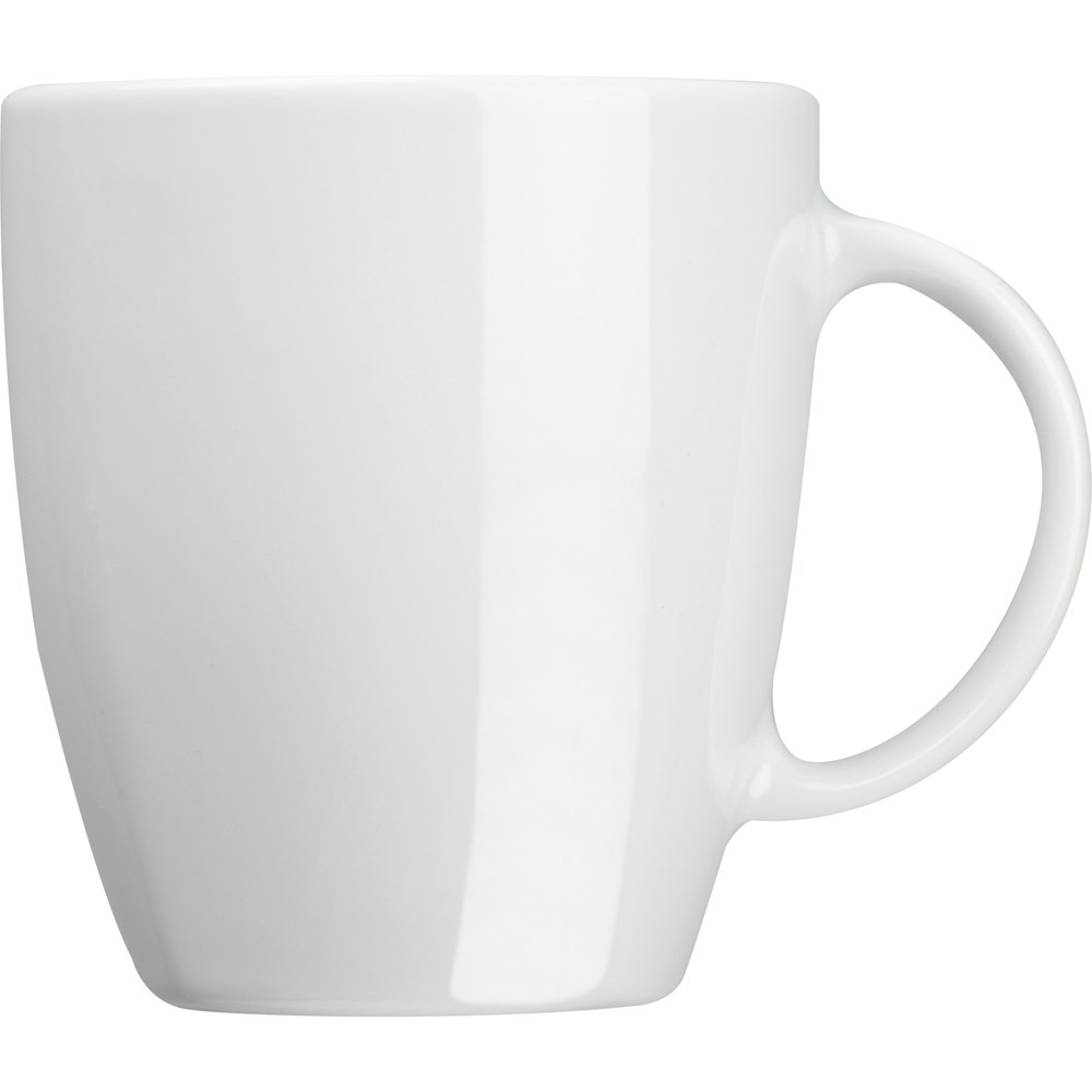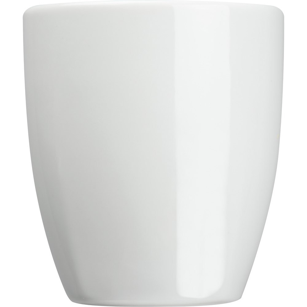 Tasse aus Porzellan mit einem Füllvermögen von 300 ml in einer ungewöhnlichen Form die sich von rund nach eckig wandelt. Ihre Werbung wird auf der Tasse im oberen Drittel angebracht.