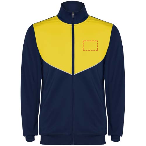 Trainingsanzug aus leichtem und elastischem Stoff. Jacke mit farblich abgesetzten Nähten im Brustbereich. Hoher Kragen mit Kontrastnähten. Zentraler Frontreißverschluss. Seitentaschen. 2x2-Rippenbündchen an Ärmeln und Bund. Hose mit elastischem Bund und Kordelzug. Seitliche Kontrasteinsätze mit Steppnaht. Beinsaum mit Reißverschluss.