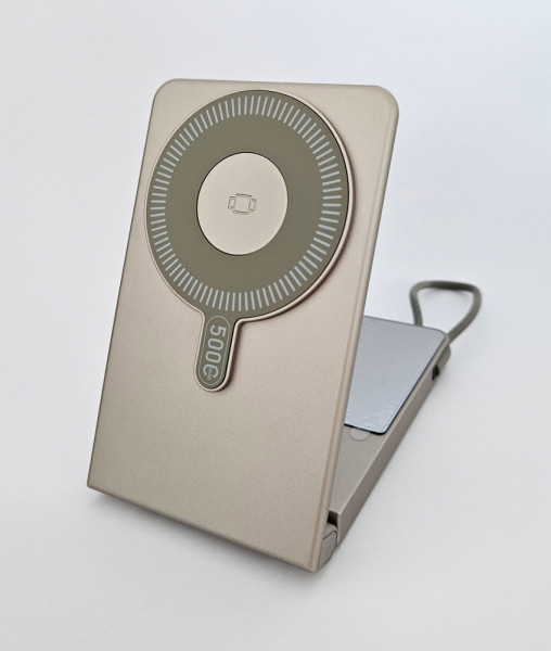 Wireless-Powerbank mit magnetischer Ladefläche, aufstellbar, mit integriertem Ladekabel und Spiegel. Zur Haftung benötigt das Smartphone eine magnetische Rückseite oder ein magnetisches Ladecase. Kapazität: 5.000 mAh. Maße: ca. 112 x 69 x 13,5mm. Input USB-C Port: PD 18W. Input via integriertem USB-C Kabel: PD 18W. Output via Integriertem USB-C Kabel: PD 20W. Wireless Output: 15W für Smartphones, 2.5W für Watches, 3W für In Ears. Farben: weiß, schwarz, gold. Veredelung: 1c Druck an einer Position inklusive. Verpackung: weiße Faltschachtel.