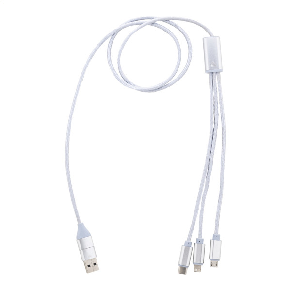 USB-Ladekabel aus recyceltem Aluminium und RPET mit Micro-USB-, USB-C- und Lightning-Anschlüssen. Mit USB- und USB-C-Eingängen. Kabellänge: 100 cm.