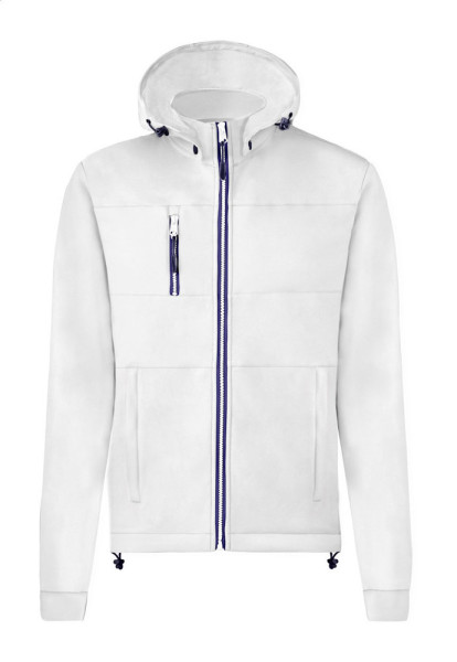 Wind- und wasserfeste Softshell-Jacke mit Reißverschluss, 2 Seitentaschen, 1 Vordertasche, Stehkragen und abnehbarer Kapuze. Material: 100% Polyester, 300g/m².