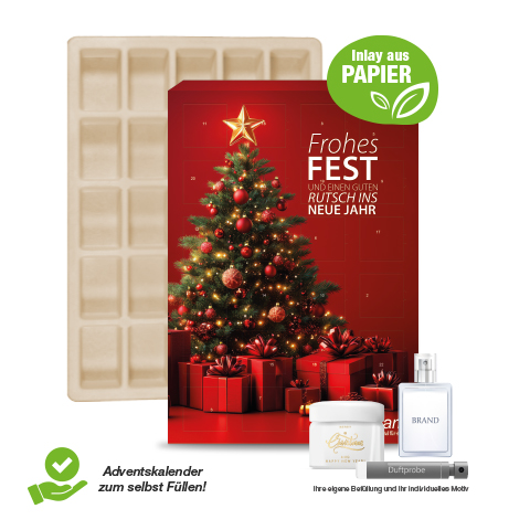 Hier bestimmen Sie den Inhalt komplett selbst! Verwirklichen Sie Ihre persönliche Adventskalender-Idee! Füllen Sie Ihren individuell bedruckten Adventskalender ganz nach Ihren Wünschen, z.B. mit Warenproben, mit Süßigkeiten oder mit Werbegeschenken. Der ideale Adventskalender mit eigenem Motiv und individueller Befüllung. Produktdetails: Adventskalender im Hoch- oder Querformat, (FSC®-zertifiziert). 4-farbig bedruckt, zum Selbstbefüllen. Lieferung ohne Inhalt. Kalenderhülle verklebt, flachliegend. Fachgrößen: 22 Fächer 50 x 34 x 27 mm und 2 Fächer 60 x 30 x 27 mm. Gleich mitbestellen: Stabiler Einzelkarton für den Postversand an Ihre Kunden: 0,99 Euro pro Stück. Nachhaltigkeit: Wir verwenden FSC®-zertifizierten Karton aus nachhaltiger Forstwirtschaft und anderen kontrollierten Quellen. Inlay aus Papier, Entsorgung zusammen mit Altpapier. Für jede Bestellung mit uns wird ein Baum über Grow my Tree gepflanzt.