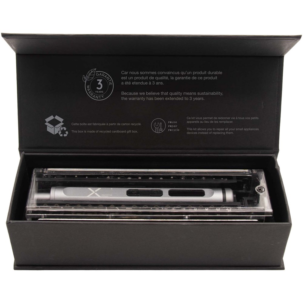 Set mit einem Elektroschraubendreher aus Aluminium und 40 Bits für die Reparatur von Kleingeräten und andere Heimwerkerarbeiten. Die Bits werden magnetisch im Schraubendreher gehalten. Auf der Aufbewahrungsbox ist das Logo „REUSE REPAIR RECYCLE“ eingraviert. Verpackt in einer Geschenkbox aus recyceltem Karton.
