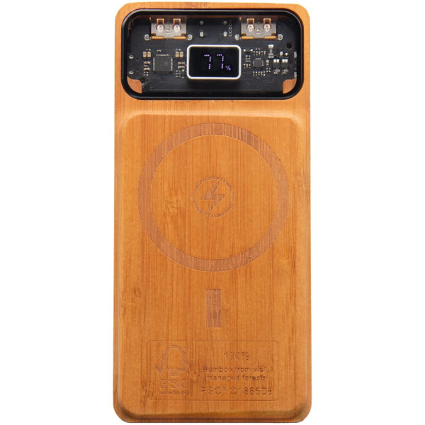 10.000 mAh Powerbank aus 65 % Holz, mit beleuchtetem Logo und MagSafe-Technologie, mit der die Powerbank magnetisch an der Rückseite Ihres iPhones (12 und neuer) befestigt werden kann. Die Powerbank verfügt über eine digitale Anzeige und einen USB-Typ-C Ausgang/Eingang und wird mit einem 3-in-1 rPET-Kabel (5 V/2 A) mit 3 Anschlüssen (Typ-C, Micro-USB und iPhone) ausgeliefert. Wenn Ihr Telefon die MagSafe-Technologie nicht unterstützt, aber kabelloses Laden möglich ist, können Sie den mitgelieferten Metallring-Aufkleber auf der Rückseite des Telefons anbringen, um es mit dem Magnethalter kompatibel zu machen. Wird in einer Geschenkbox aus recyceltem Karton geliefert (18,6 × 10 × 2,6 cm).