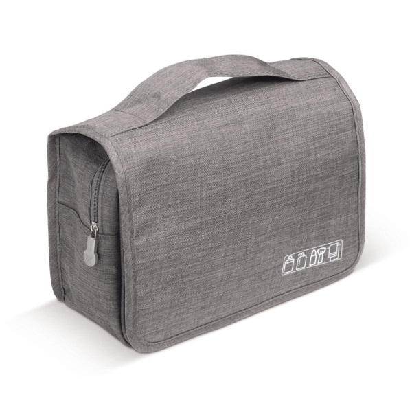 Praktischer Kulturbeutel mit verschiedenen Fächern. Der Haken ermöglicht es, ihn aufzuhängen.