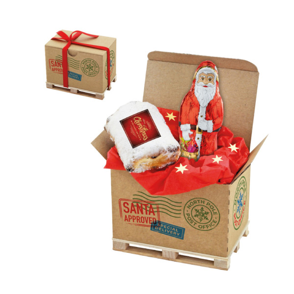 1 origineller Palettencontainer aus Karton und Standard-Druck "Santa Approved - Special Delivery" mit rotem Schleifenband verschnürt auf einer Minipalette aus Echtholz, gefüllt mit: 1 Gourmet-Christstollen 80 g und 1 Schoko-Weihnachtsmann 25 g • Die praktische Cargo-Box kann mit einem Druck 1c oder 4c, einem Aufkleber 4c, einem Anhänger 4c an der Schleife und ab 3000 Stück mit einem 4c All-Over-Druck individualisiert werden. Auch die Mini-Holz-Palette kann mit einem 1c Druck veredelt werden.