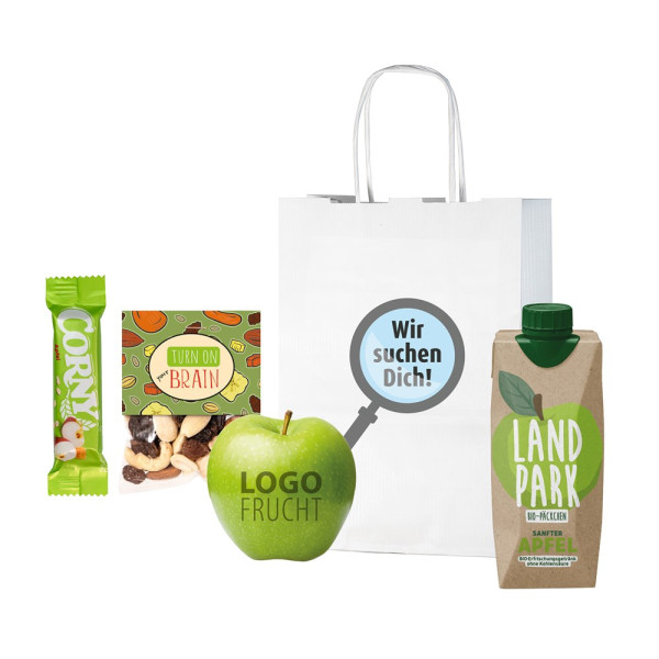 1 LOGOFrucht Apfel grün inkl. LOGOFrucht-Druck Blackberry, 1 Papiertragetasche mit gedrehten Papierkordeln inkl. Standard-Druck "Apfel", 1 Corny Riegel Apfel 25 g, 1 Beutel Studentenfutter 40 g und 1 Landpark Bio-Quelle Sanfter Apfel 500 ml (Erfrischungsgetränk, stilles Bio-Mineralwasser mit Apfel-Geschmack) • Der Apfel wird mit einem schonenden Druckverfahren und hochwertigen Lebensmittelfarbstoffen bedruckt, es stehen 6 Druckfarben zur Verfügung: Raspberry, Kiwi, Strawberry, Hazelnut, Blackberry und Goldberry. Im Gegensatz zur Lasergravur wird die Schale des Apfels nicht beschädigt und er bleibt länger frisch und saftig. Die Papier-Tüte kann auf der Vorderseite optional mit einem 4c Druck individualisiert werden.