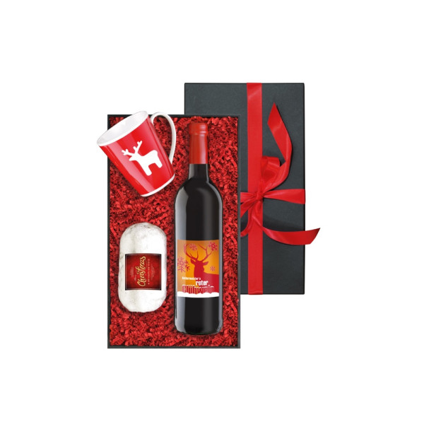 1 Flasche Glühwein 1,0 Liter, 1 exklusive Glühweintasse und 1 Gourmet-Christstollen 200 g, verpackt in einer hochwertigen Geschenk-Schatulle (2-teilig) und Postversandkarton. • Optional kann die Geschenkverpackung mit einem Anhänger 4c an der Schleife, einer Banderole 4c um die Schatulle herum oder mit einem Druck 1c direkt auf den Deckel individualisiert werden. Zusätzlich können auch die Glühweinflasche und der Gourmet-Christstollen mit einen Etikett 4c individuell gestaltet werden. Das Präsent ist postversandfähig verpackt. Alkoholgehalt: 9,50 % . Enthält Sulfite. Trinkempfehlung: Glühwein sollte nicht gekocht werden und maximal auf 72 Grad erhitzt werden.