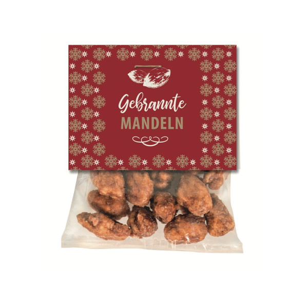 1 Beutel feuergebrannte Mandeln, 30 g. • Köstliche gebrannte Mandeln verpackt in einem Folientütchen mit Standard-Reiter „Gebrannte Mandeln“. Mögliche Individualisierung: Reiter mit 4c-Digitaldruck, hierbei können Vorder- und Rückseite bedruckt werden.