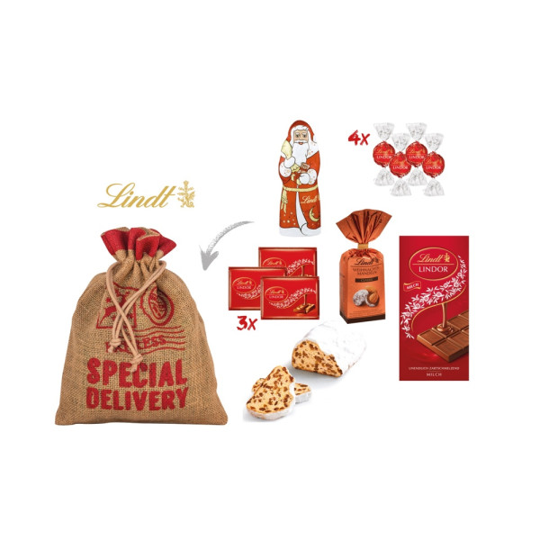 1 weihnachtliches Geschenkset nachhaltig verpackt im Jutebeutel mit Aufdruck „Special Delivery“, gefüllt mit: 1 Gourmet-Christstollen 200 g, 4 Lindt Lindor-Kugeln je 12,5 g, 1 Lindt Lindor-Schokolde 100 g, 1 Lindt Weihnachtsmann 40 g, 1 Beutel Lindt Weihnachtsmandeln 100 g (gerösteten Mandeln in Gianduja Milchschokolade und Vollmilchschokolade) und 3 Lindt Naps Lindor je 7,3 g. • Der Gourmet-Christstollen kann mit einem Kunden-Logo (Etikett 4c) individualisiert werden und auch der Jute-Beutel kann mit einem Anhänger 4c veredelt werden. Das Set kann optional für den Postversand an Mitarbeiter und Kunden einzeln mit Grußkarte im Versandkarton konfektioniert werden.