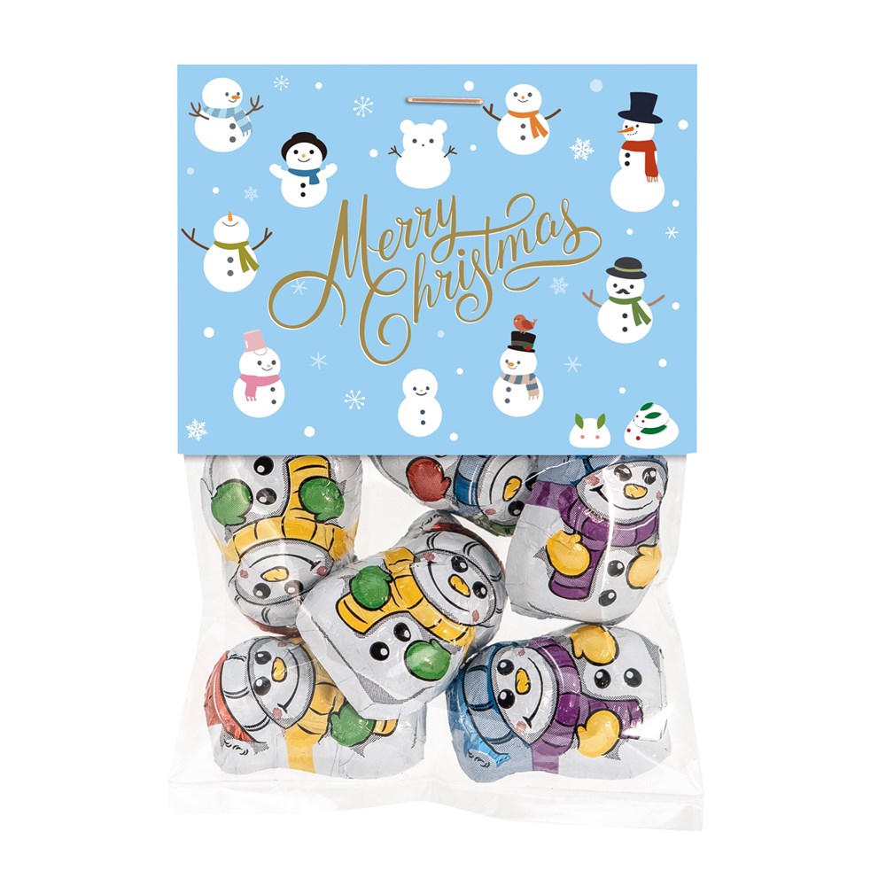 1 Beutel Mini-Schneemänner aus Vollmilchschokolade 30 g. • Mini-Schneemänner aus Vollmilchschokolade verpackt in einem Folientütchen mit Standard-Reiter „Merry Christmas“. Mögliche Individualisierung: Reiter mit 4c-Digitaldruck, hierbei können Vorder- und Rückseite bedruckt werden.