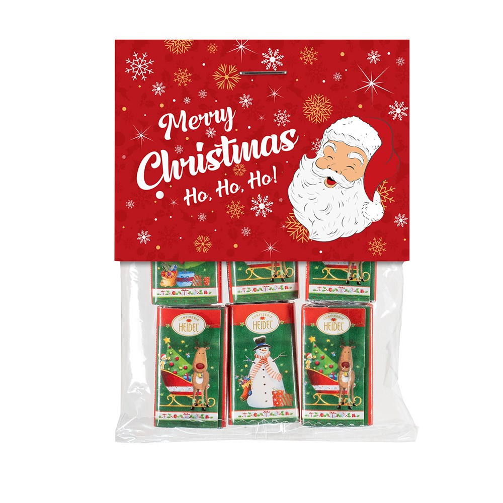 1 Beutel mit 6 Mini-Schoko-Täfelchen Napolitains je 3 g (einzeln verpackte Mini-Täfelchen aus Edel-Vollmilch-Schokolade mit verschiedenen Weihnachtsmotiven) verpackt in einem Folientütchen mit Standard-Reiter „Merry Christmas“. • Mögliche Individualisierung: Reiter mit 4c-Digitaldruck, hierbei können Vorder- und Rückseite bedruckt werden.