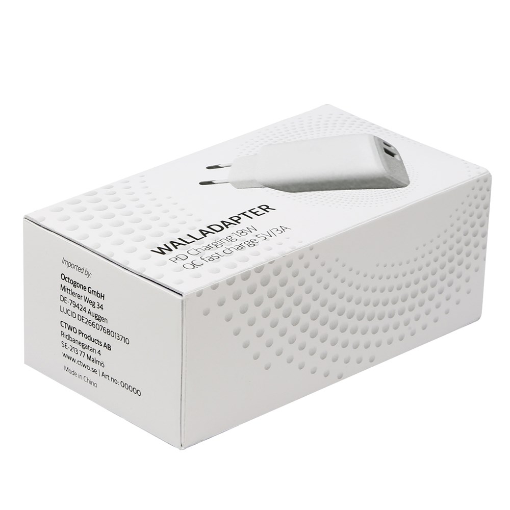 Adapter mit Power Delivery Fastcharge TÜV GS Zertifkzierte Qualität USB C und USB A 3.0 Input 100-240 V 50/60 Hz 0,5 A PD Output: 5 V 3 A = 15 Watt 9 V, 2,22 A = 20 Watt 12 V, 1,67 A = 20 Watt USB Output 5 V 3 A = 15 Watt 9 V, 2 A = 20 Watt 12 V, 1,5 A = 20 Watt Output gesamt 5V = 3A Einzeln verpackt im weißen Displaykarton
