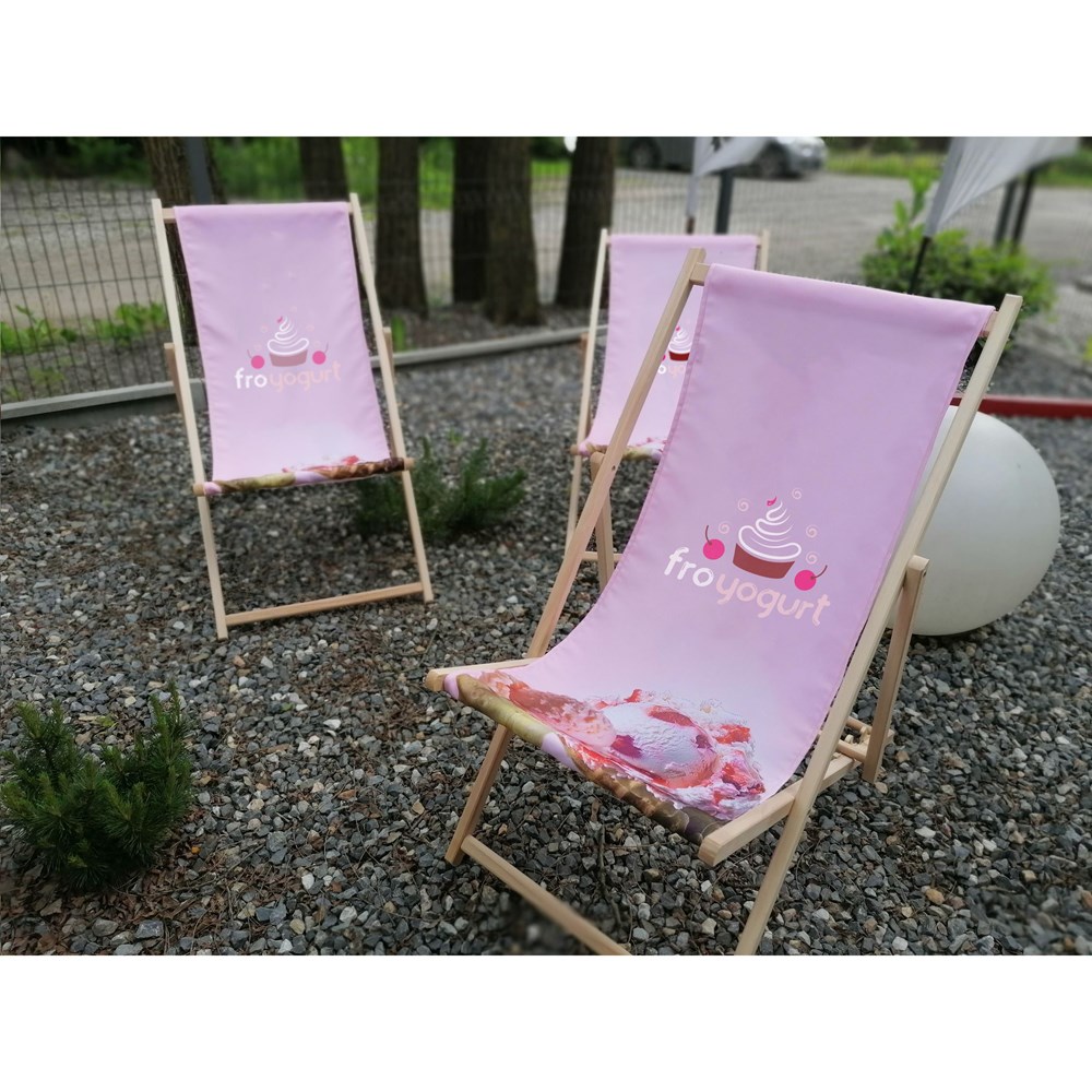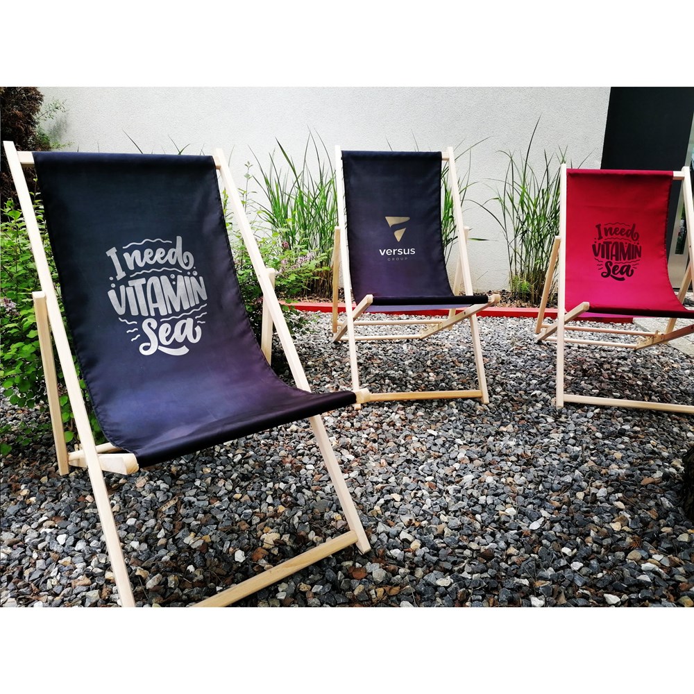 Strandstuhl mit Buchenholzrahmen und 100% RPET-Polyesterbezug. Der Rahmen dieses Stuhls ist in 3 verschiedene Positionen verstellbar. Maximales Tragegewicht 120 kg. Sie können auch mittels Transferdruck ein Logo an der Oberseite der Leinwand anbringen. Made in Europa.