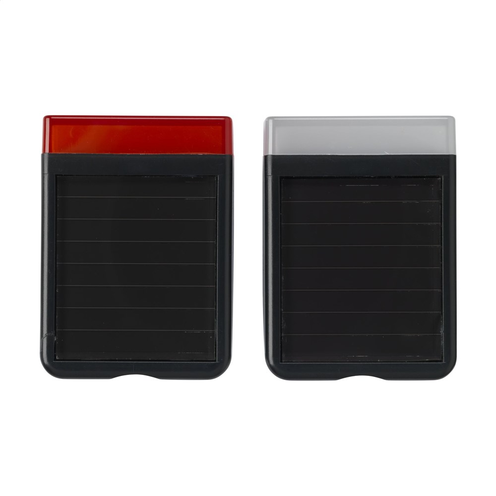 Set von wasserdichten, ABS Fahrradlampen mit Solarenergie. Die Leuchten sind mit einem effizienten Solarmodul ausgestattet, das die Batterie immer geladen hält. Front- und Rücklicht mit je 2 LED-Leuchten und stabilem Gehäuse. Aufladen: in der Sonne innerhalb von 3 Stunden. Lädt an einem bewölkten Tag 50 % auf. Einstellbares Blink- und Dauerlicht. Das Licht ist hell genug, um aus 100 Metern Entfernung sichtbar zu sein. Einfach und schnell mit Klettbändern zu befestigen. Wird einzeln in einem Kraftkarton geliefert.