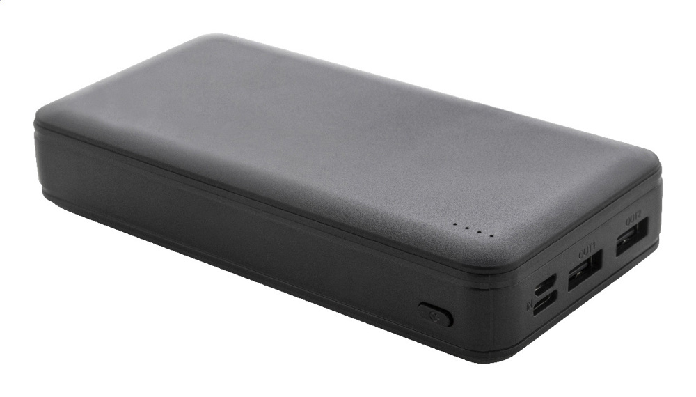 Powerbank aus recyceltem ABS mit 20000 mAh Akku. Mit zwei USB- und einem USB-C-Ladeanschluss. Micro-USB- und USB-C-Eingang. Inklusive USB-Ladekabel.