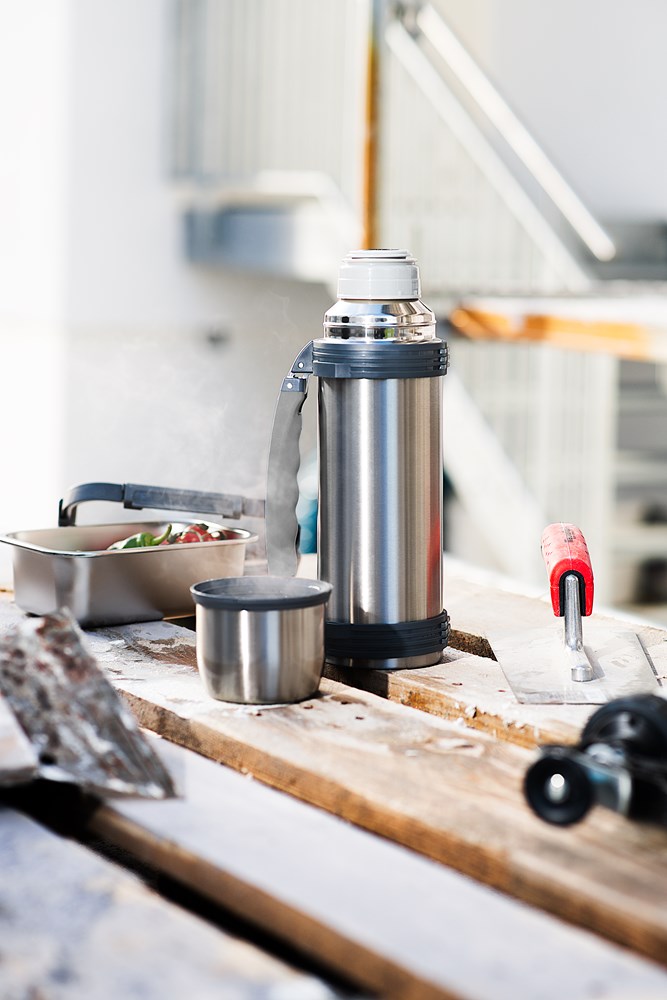 Für Baumeisterinnen und Baumeister und alle die es werden wollen. Mit Schraubdeckel als Trinkbecher und stabilem Klappgriff. Material: Edelstahl und ABS, silber Plastikfreie Einzelverpackung Maße: 313 x Ø 100 mm Gewicht ohne Verpackung: 816 g