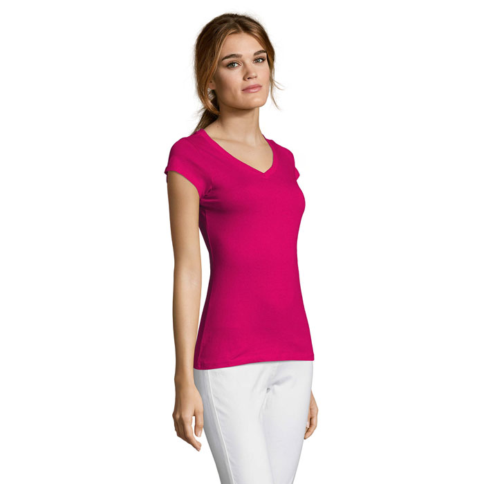 SOL'S MOON Damen-T-Shirt mit tiefem V-Ausschnitt und taillierter Schnittführung. Rippkragen, Nackenband, Kurzarm, Seitennähte. Material: 150g/m² 100% halbgekämmte, ringgesponnene Baumwolle.