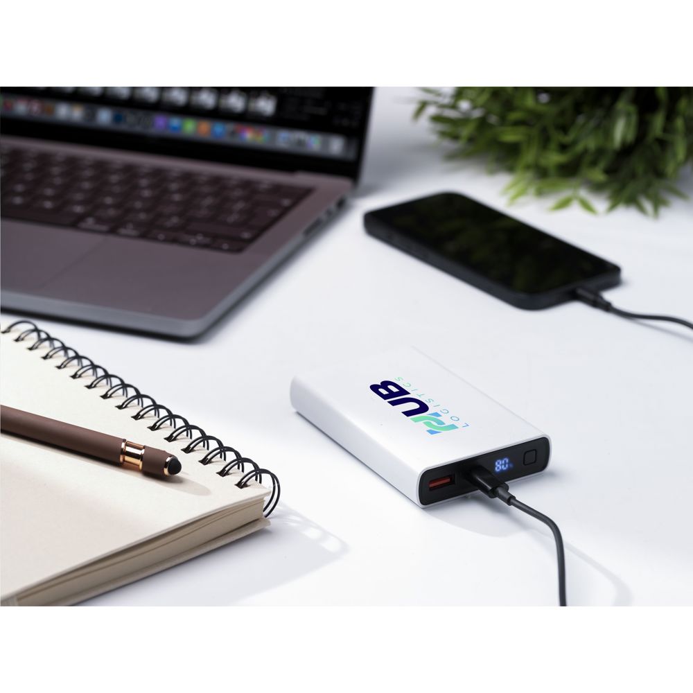 Leistungsstarke Powerbank mit integriertem 10.000-mAh-Lithium-Polymer-Akku. Das Gehäuse besteht zu 100% aus RCS-zertifiziertem recyceltem ABS. Mit Ein-/Aus-Taste und Display mit prozentualer Akkuanzeige. Typ-C-Eingang: DC5V/3A, 9V/2A, 12/1,5A. Typ-C-Ausgang: DC5V/3A, 9V/2,22A, 12/1,67A. USB-A-Ausgang: DC5V/3A, 9V/2A, 12/1,5A. Kabelgebundener Ausgang: 22W. Inklusive rTPE USB-C-zu-USB-C-Ladekabel und Gebrauchsanweisung. Verpackt pro Stück.