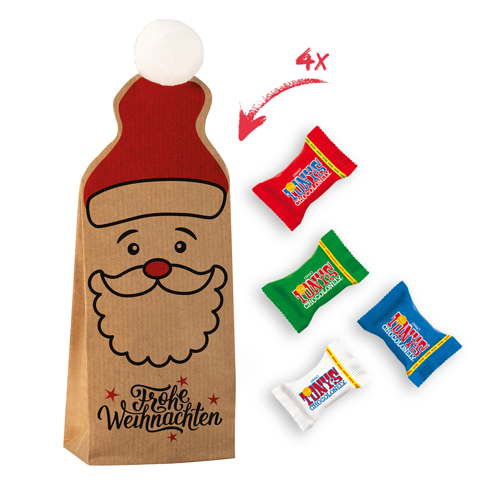 Christmas Bag mit Standard-Druck "Frohe Weihnachten", gefüllt mit 4 Tiny Tony`s je 9,0 g. • Die ultimative Weihnachtstüte aus Papier! Ein schelmischer Blick, rote Mütze, ein Bommel aus reiner Baumwolle - so sieht ein ökologisch wertvoller Hingucker aus, gefüllt mit 4 Stück Tiny Tony's, das sind Mini‑Schokoladentäfelchen in unterschiedlichen Sorten: Milch, Milch Karamell Meersalz, Milch Nougat, Milch Haselnuss, Zartbitter Mandel Meersalz, Dunkle Milch, Dunkle Milch Brezel, Dunkle Milch Brezel, Weiße Schokolade und Weiße Schokolade Himbeere Knusper (Sortierung kann von der Abbildung abweichen). Die Christmas Bag kann optional mit einem 4c Druck, 1c Druck oder einem 4c Aufkleber individualisiert werden.