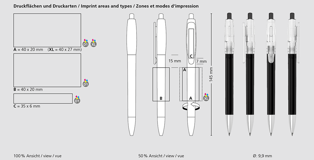 Der Klix transparent Mn ist ein Druckkugelschreiber. Materialien und Oberflächen: Spitze: Messing vernickelt. Schaft, Oberteil und Drücker: Kunststoff (M-ABS) transparent. Minenröhrchen: Recyceltes Polypropylen (rPP). Standardfarben: Schaft, Oberteil und Drücker: aus 12 Farben kombinierbar. Sonderfarben: ab 5.000 Stück, ab 25.000 Stück ohne PMS-Zuschlag. Standardmine: Silktech L (3.000 m), blau oder schwarz, Mine optional: Silktech XL, Multifill P, Multi-Gel.