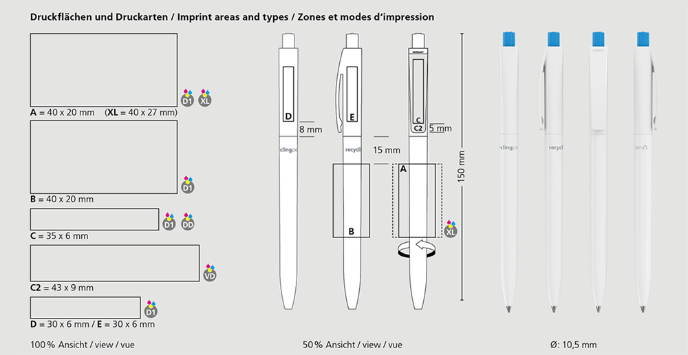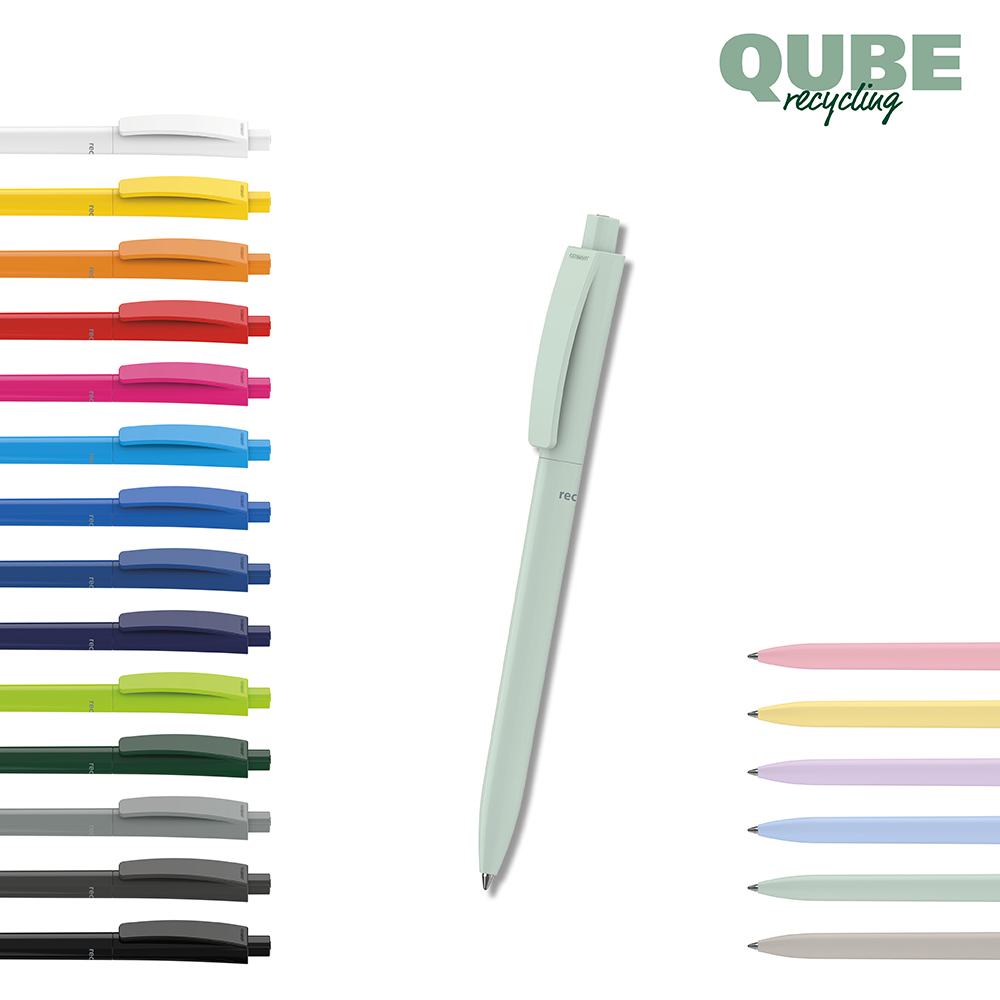 Der Qube recycling ist ein Druckkugelschreiber. Materialien und Oberflächen: Schaft, Oberteil und Drücker: Kunststoff (rABS) hochglänzend, recycelt. Minenröhrchen: Recyceltes Polypropylen (rPP). Standardfarben: Schaft, Oberteil und Drücker: aus 20 Farben kombinierbar. Hinweis: Aufgrund der recycelten Rohstoffe kann es zu Farbabweichungen auch bei einzelnen Bauteilen eines Produktes kommen. Sonderfarben: ab 5.000 Stück, ab 25.000 Stück ohne PMS-Zuschlag. Standardmine: Silktech L (3.000 m), blau oder schwarz, Mine optional: Silktech XL, Multifill P, Multi-Gel.