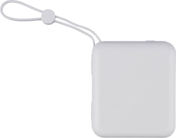 Recycelte Powerbank aus ABS verfügt über einen 10.000-mAh-Li-Ionen-Akku und einen 22,5-W-Schnellladeausgang. Sie ist mit einer integrierten TPE-Trageschlaufe ausgestattet, die gleichzeitig als Ladekabel mit Lightning- und Typ-C-Anschlüssen dient. Auf der Oberseite befindet sich eine digitale LED-Anzeige, die die Akkukapazität anzeigt. Sie verfügt über einen Typ-C-Ein-/Ausgang und einen Typ-A-Eingang. Sie bietet Schutz vor Überhitzung, Kurzschluss, Überspannung und Überstrom. Auf der Rückseite befindet sich ein Etikett mit dem Recycled-ABS-Logo. Sie ist einzeln verpackt in einem braunen Karton mit Seidenpapier im Inneren.