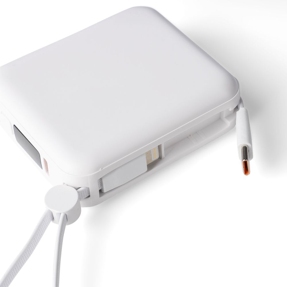 Recycelte Powerbank aus ABS verfügt über einen 10.000-mAh-Li-Ionen-Akku und einen 22,5-W-Schnellladeausgang. Sie ist mit einer integrierten TPE-Trageschlaufe ausgestattet, die gleichzeitig als Ladekabel mit Lightning- und Typ-C-Anschlüssen dient. Auf der Oberseite befindet sich eine digitale LED-Anzeige, die die Akkukapazität anzeigt. Sie verfügt über einen Typ-C-Ein-/Ausgang und einen Typ-A-Eingang. Sie bietet Schutz vor Überhitzung, Kurzschluss, Überspannung und Überstrom. Auf der Rückseite befindet sich ein Etikett mit dem Recycled-ABS-Logo. Sie ist einzeln verpackt in einem braunen Karton mit Seidenpapier im Inneren.