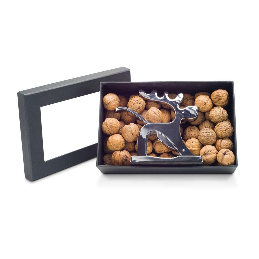 Sie können gleich loslegen: Der hochwertige, massive ROMINOX® Rentier-Nussknacker mit Federung liegt in 600 g Walnüssen. Verpackt in schönem schwarzen Sichtfensterkarton.